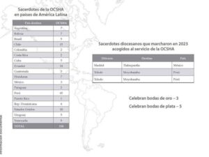 En la actualidad hay 150 sacerdotes españoles de la OCSHA distribuidos por diferentes países de América Latina. En el año 2023, los sacerdotes diocesanos que marcharon acogidos al servicio de la OCSHA pertenecen a las diócesis de Madrid y Toledo y los países de destino fueron México y Perú. En el documento informativo que ofrece la  Comisión Episcopal para las Misiones y Cooperación con las Iglesias se puede consultar más datos de los sacerdotes pertenecientes a la Obra para la Cooperación Sacerdotal Hispanoamericana .