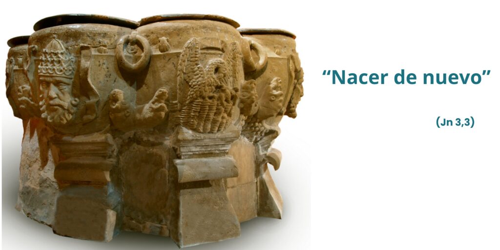 Junto con el lema que nos ocupa, hemos querido resaltar con una imagen otra de las palabras de Jesús en su diálogo con Nicodemo: el que no nazca del agua y del espíritu no puede ver el Reino de Dios (Jn 3, 5). Con esta afirmación se nos está mostrando cómo el crecimiento y el destino feliz de nuestra vida es pura gracia, pero necesita también de la aceptación libre de la persona que ha de acoger la propuesta de Dios. Se une nuestro presente histórico con la meta definitiva de nuestra existencia. El bautismo, al que hace referencia Jesús en sus palabras, es la puerta de entrada al encuentro con el Señor, a injertarnos en su misericordia, en su plan de salvación. Al quedar incorporados a Cristo, el Sol que nace de lo alto, quedamos orientados, es decir, mirando al Oriente, lugar del nacimiento del Sol. Nuestra vida, por tanto, como hemos indicado, está orientada, tiene un sentido. Se entiende, por tanto, que la imagen del cartel de nuestro curso pastoral sea una pila bautismal, con toda la simbología que encierra.