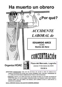 Además, con motivo del fallecimiento de un trabajador en Haro, la HOAC ha convocado un círculo de silencio el jueves 14 de marzo a las 19:30 horas en la Plaza de Mercado.