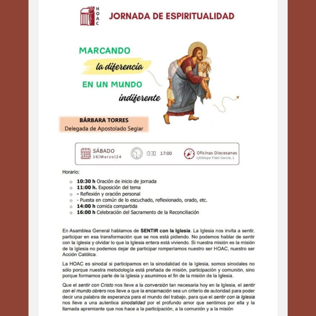 El próximo sábado 16 de marzo a las 10:30 horas. tendrá lugar en las oficinas de la Curia Diocesana, las Jornadas de Espiritualidad de la HOAC.