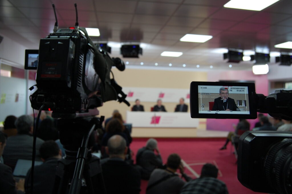 El secretario general, Mons. Francisco César García Magán, informa en rueda de prensa, el viernes 8 de marzo, de los trabajos que se están realizado en este encuentro.