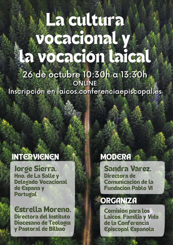 ¿INSCRIPCIÓN? Sí, la participación es gratuita y exclusivamente online, pero es imprescindible inscribirse en el siguiente formulario: https://laicos.conferenciaepiscopal.es/la-cultura-vocacional-y-la-vocacion-laical/