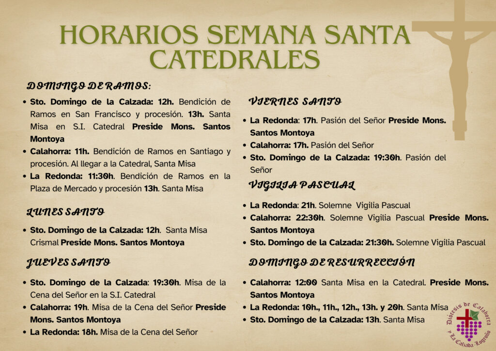 Como cada Semana Santa, la Diócesis de Calahorra y La Calzada-Logroño hace públicos los horarios de las celebraciones litúrgicas de estos días en las sedes catedralicias, especialmente aquellas que estarán presididas por el Sr. Obispo.