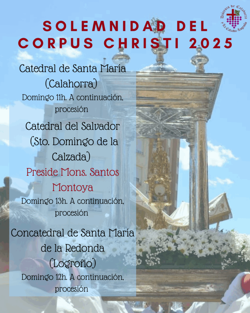 El próximo domingo 22 de junio, la Iglesia diocesana celebra la Solemnidad del Corpus Christi. En las sedes catedralicias de nuestra diócesis el horario previsto para dicha celebración es el siguiente: