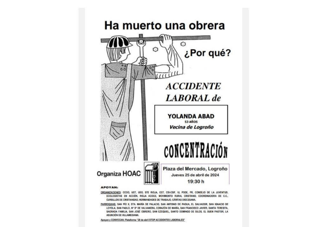 La Hermandad Obrera de Acción de Católica, HOAC, se concentra cada vez que uno una trabajadora fallece en accidente laboral para solidarizarnos con las familias afectadas, concienciar a los trabajadores/as y exigir el cumplimiento de la Ley de Prevención de Riesgos Laborales. Por ello, el próximo jueves 25 de abril, volverán a concentrarse en la Plaza del Mercado a las 19:30 horas, ante el último accidente ocurrido en Logroño esta semana.