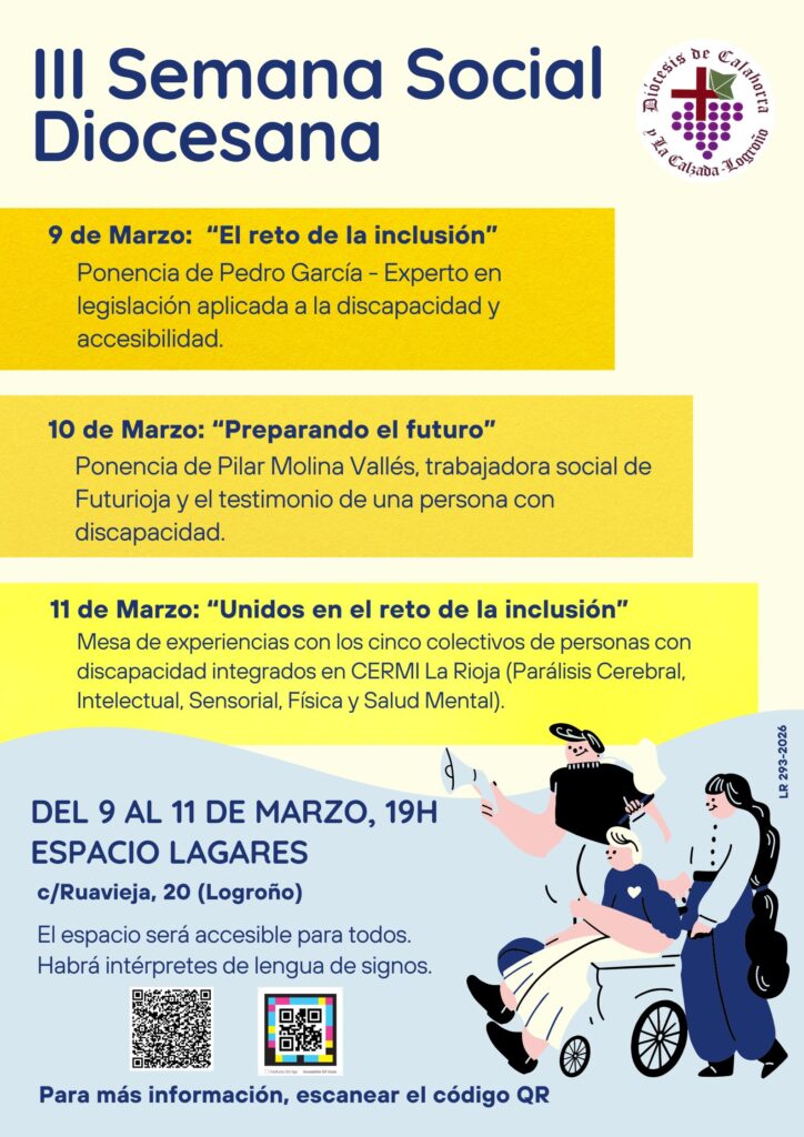 Logroño, 23 de febrero de 2026. — La Diócesis de Calahorra y La Calzada-Logroño anuncia con profunda alegría la celebración de la III Semana Social Diocesana, que este año iluminará el corazón de nuestra tierra bajo el lema: «Unidos en el reto de la inclusión». Desde el próximo lunes 9 hasta el miércoles 11 de marzo, a las 19:00 horas, el Espacio Lagares (c/ Ruavieja, 20, Logroño) se convertirá en un punto de encuentro, escucha y diálogo para reflexionar sobre el papel de las personas con discapacidad en la sociedad y en el seno de la Iglesia católica.