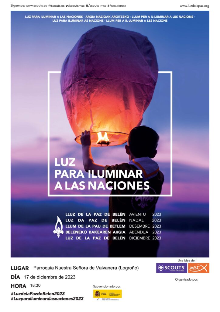 Este año la Luz llegará a España a través de Murcia que será la delegación encargada de su traslado a nuestro país. Desde allí será repartida a toda España y el Movimiento Scout Riojano MSC hará el reparto oficial en nuestra comunidad el próximo Domingo 17 de diciembre en la Parroquia Nuestra Señora De Valvanera a las 18:30 horas.