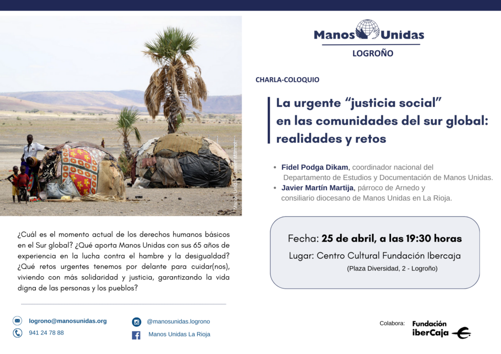 Manos Unidas y el Centro Ibercaja La Rioja, en la conmemoración del 65º aniversario del lanzamiento de la primera Campaña contra el Hambre, proponen a toda la sociedad riojana un encuentro de ideas, reflexión y diálogo con esta Charla-Coloquio, bajo el título «La urgente “justicia social” en las comunidades del sur global: realidades y retos»