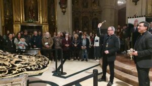 Esta tarde, además, el restaurador Sebastián Marchante Gambero ofrecerá una charla en la que hablará del proceso de restauración del Manto. Será a las 20.20 horas en el Altar Mayor de la Concatedral Santa María de la Redonda -en un principio se iba a celebrar en el Espacio Lagares (calle Ruavieja, 18), pero el interés despertado ha superado las previsiones de la Cofradía y las personas interesadas en asistir sobrepasaban, con creces, el aforo permitido en Lagares-.