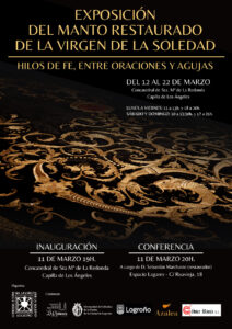 La Cofradía de Nuestra Señora la Virgen de la Soledad de Logroño ha presentado hoy su Manto restaurado y ha organizado también una exposición bajo el título ‘Hilos de Fe. Entre oraciones y agujas’, en la que se podrá ver el nuevo Manto de La Soledad, una pieza artística y devocional, que vistió por vez primera la Virgen de la Soledad en procesión hace 75 años.