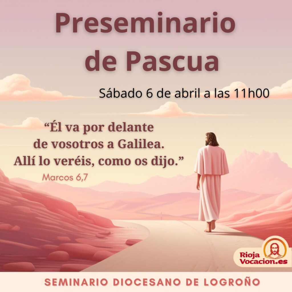 Recordaros que el próximo sábado 6 de abril tendremos en el Seminario Diocesano de Logroño nuestro encuentro de Preseminario. Os invitamos a vivir el inicio de la Pascua, pasando del miedo a la Alegría, de la oscuridad a la Luz, de la muerte a la vida del Jesús resucitado. Entre Emaús y Galilea compartiremos nuestra jornada.