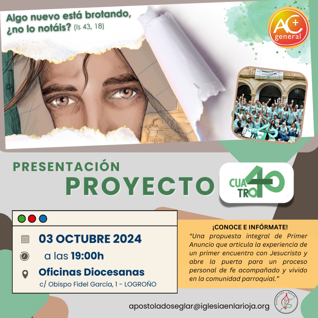 A todos los laicos (miembros de consejos parroquiales, catequistas, educadores, familias, voluntarios...), a la vida consagrada y a los sacerdotes, hacemos llegar esta CONVOCATORIA e INVITACIÓN para que conozcáis -de primera mano- QUÉ ES el «PROYECTO Cuatro40». Una propuesta integral de Primer Anuncio que articula la experiencia de un primer encuentro con Jesucristo y abre la puerta para un proceso personal de fe acompañado y vivido en la comunidad parroquial, enmarcada en el proyecto de Acción Católica General. Una propuesta llena de esperanza para renovar nuestras comunidades parroquiales desde el Anuncio, los Procesos y la Comunidad.