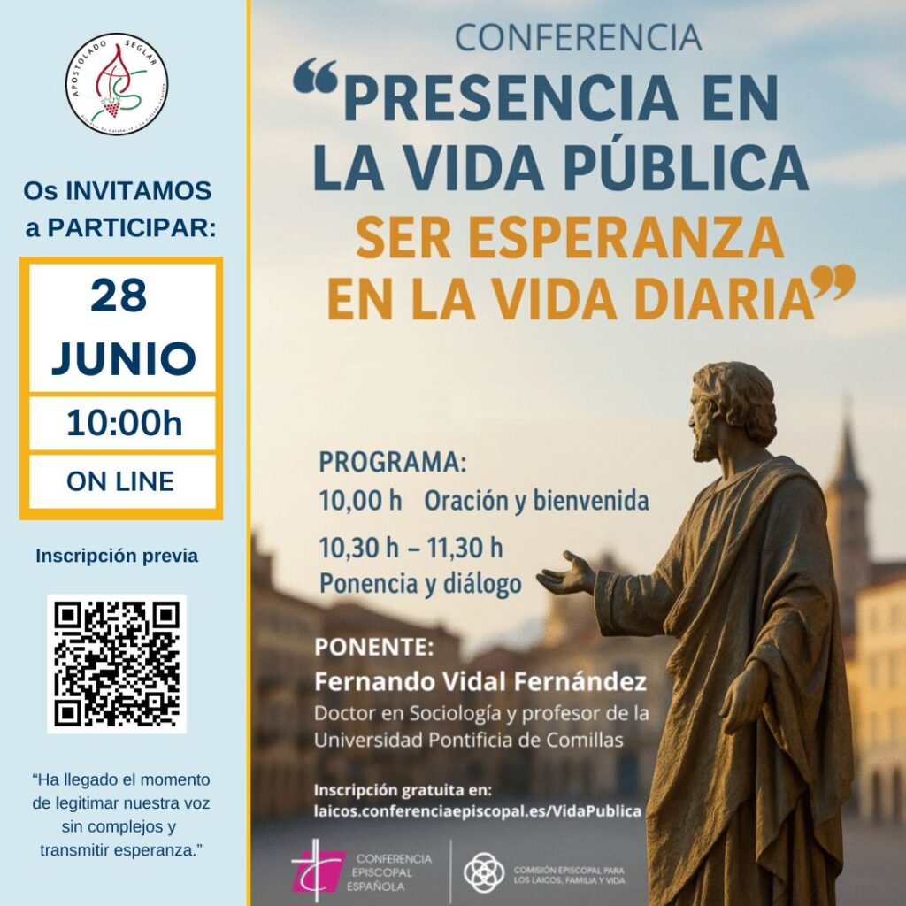La Comisión Episcopal para los Laicos, Familia y Vida organiza una jornada de formación online con la conferencia titulada Presencia en la Vida Pública. Ser esperanza en la vida diaria, que será ofrecida por Fernando Vidal Fernández, Doctor en Sociología y profesor de la Universidad Pontificia de Comillas.