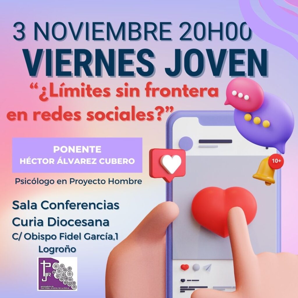 Estrenamos mes y “VIERNES JOVEN”. Una nueva oportunidad de encontrarnos los jóvenes riojanos y adentrarnos en uno de los temas más apasionantes de nuestro tiempo: “lo que escribimos, pensamos y somos en las redes sociales”. Todo un mundo lleno de desafíos que nuestro ponente y psicólogo de Proyecto Hombre, Héctor Álvarez expondrá el viernes 3 de noviembre a las 20h00 en la Sala de Conferencias de la Curia Diocesana. Al finalizar, ofreceremos una merienda a los asistentes.